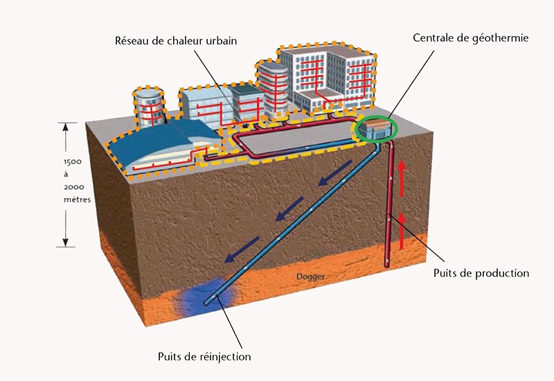 La géothermie profonde permet d’utiliser de l’eau naturellement chaude provenant d’une formation géologique située à 1500 m sous nos pieds. Cette énergie renouvelable peut être utilisée pour chauffer des bâtiments au travers d’un réseau de chaleur urbain (RCU).